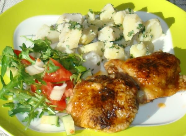Két evőkanál olajat, a citrom lereszelt héját és kicsavart levét a fűszerekkel botmixer poharába tesszük. Nem kell megijedni, a fahéj alapvetően csípős fűszer, a mediterrán konyha sokszor használja húsos ételekhez. Egynemű masszává törjük, majd a combokra kenjük és fél órára félretesszük. A félretett olajat és fél deci vizet tepsibe öntünk, a combokat a bőrrel felfelé belehelyezzük. A tepsit fóliával szorosan lefedjük és 180 fokos sütőben háromnegyed órát sütjük. Ekkor a fóliát levesszük és még tíz percre visszatoljuk a sütőbe.