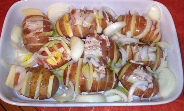 A szép, tojásnál nagyobb burgonyákat megmossuk, majd leszárítjuk. Evőkanálba fektetjük, így biztosítjuk, hogy ne vágjuk át teljesen, majd fél centinként felszeleteljük. A nyílásokba, felváltva, bacon, hagyma és sajtszeleteket teszünk. Kevés olajjal kikent tűzálló tálba helyezzük a krumplikat, sóval, borssal meghintjük, majd az olajjal megpermetezzük, fóliával, szorosan lefedve, 175 fokos sütőbe tesszük és fél órát pároljuk. A fóliát levéve, még negyed óra alatt, pirosra sütjük.