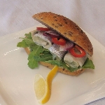 A bucikat majdnem kettévágjuk és megkenjük a majonézzel. Rukkola levelekkel borítjuk, majd rárakosgatjuk a heringtekercseket. A tetejére vékonyra szelt paradicsomot és lilahagymát teszünk. Ízlés szerint sóval, borssal megszórjuk.