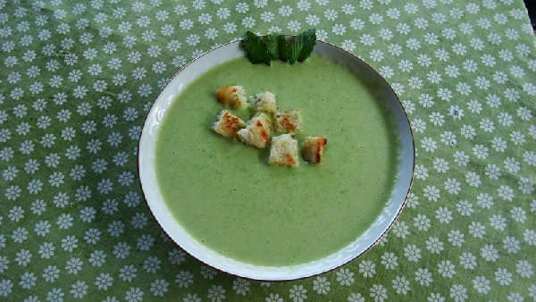 A felhevített vajon megpároljuk a zöldborsót, majd felöntve a zöldségalaplével puhára főzzük. Közben sóval, borssal, cukorral ízesítjük. Végül belekeverjük a tejszínt, a mentát és rövid összeforralás után botmixerrel összetörjük.