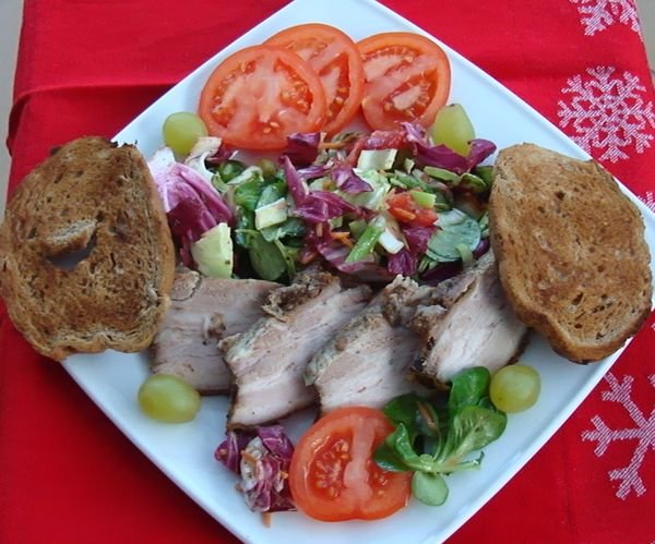A hús bőrét, de csak a bőrét bevagdossuk, majd a sóval és borssal bedörzsöljük. A darabokra vágott zöldségekre fektetjük, a bőrével lefelé. Aláöntjük a bort és alufóliával lefedjük. 200 fokra előmelegített sütőben 20 percig sütjük. A húst megfordítjuk és a sütő hőjét 140 fokra visszavéve, még másfél órát pároljuk. Párolás közben a levével locsolgassuk. Kihűlve szeleteljük fel és idénysalátával valamint pirítóssal tálaljuk.