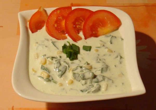 A joghurtot tüllel bélelt szitába öntjük és fél órát csepegtetjük. Így a török-görög joghurthoz hasonló textúrát érünk el, persze vehetjük az eredetit is, de sokkal drágább. A joghurtot ízesítsük a zúzott fokhagymával, sóval és borssal. Keverjük el a vékony csíkokra vágott spenóttal és a kukoricával.