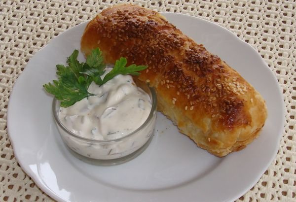 A tésztát hat darabra vágjuk, majd a közepére szórjuk a megreszelt sajtokat, rátesszük a virslit és a tészta szélét tojással megkenve, feltekerjük. A tetejét is megkenjük tojással, majd megszórjuk szezámmaggal. 220 fokra előmelegített sütőben 20 perc alatt megsütjük. Az ízesített tartárral tálaljuk.